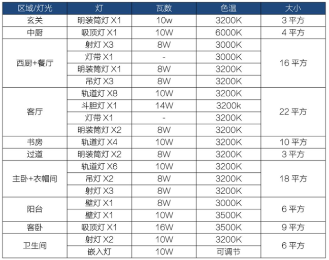 下面,我們將以無主燈照明為例,通過一張表的形式,來告訴大家,居家的各個空間該如何選燈,選多大瓦數(shù)的,用什么樣的色溫值。